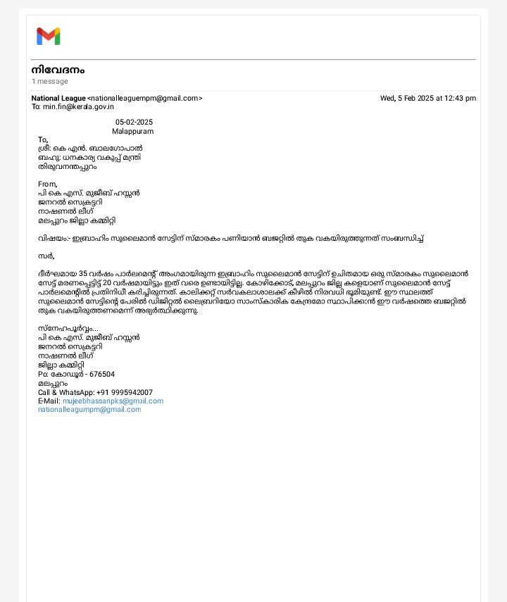 മലപ്പുറം: ദീർഘമായ 35 വർഷം പാർലമെന്റ് അംഗവും നാഷണൽ ലീഗ് സ്ഥാപക പ്രസിഡന്റുമായിരുന്ന ഇബ്രാഹിം സുലൈമാൻ സേട്ടിന് ഉചിതമായ സ്മാരകം പണിയാൻ ഈ വർഷത്തെ ബജറ്റിൽ ഫണ്ട് വകയിരുത്തണമെന്ന് നാഷണൽ ലീഗ് ജില്ലാ ജനറൽ സെക്രട്ടറി പി കെ എസ്. മുജീബ് ഹസ്സൻ ധനകാര്യ മന്ത്രി കെ എൻ. ബാലഗോപാലിന് സമർപ്പിച്ച നിവേദനത്തിൽ അഭ്യർത്ഥിച്ചു.