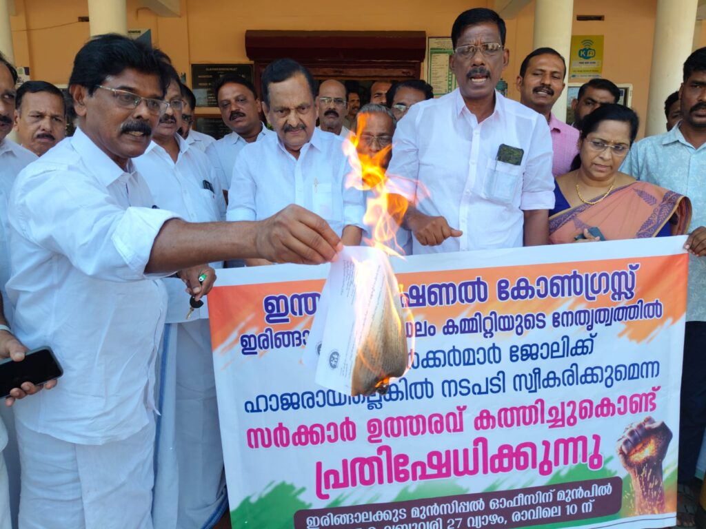 ഇരിങ്ങാലക്കുട : ഇന്ത്യൻ നാഷണൽ കോൺഗ്രസ് മണ്ഡലം കമ്മറ്റിയുടെ നേതൃത്വത്തിൽ ആശാ വർക്കർമാർക്ക് ജോലിക്ക് ഹാജരായില്ലെങ്കിൽ നടപടി സ്വീകരിക്കുമെന്ന സർക്കാർ ഉത്തരവ് കത്തിച്ച് പ്രതിഷേധിച്ചു. മുൻസിപ്പൽ ഓഫീസിനു മുന്നിൽ നടന്ന പ്രതിഷേധ ധർണ്ണ കെ.പി.സി.സി. മുൻ ജനറൽ സെക്രട്ടറി എം.പി. ജാക്സൺ ഉദ്ഘാടനം ചെയ്തു. മണ്ഡലം പ്രസിഡണ്ട് സി.എസ്. അബ്ദുൾ ഹഖ് അധ്യക്ഷത വഹിച്ചു. നഗരസഭാധ്യക്ഷ മേരിക്കുട്ടി ജോയ്, വൈസ് ചെയർമാൻ ബൈജു കുറ്റിക്കാടൻ, മുൻ വൈസ് ചെയർമാൻ ടി.വി. ചാർളി , കെ. വേണുമാസ്റ്റർ , ജസ്റ്റിൻ ജോൺ, സിജു യോഹന്നാൻ , എ.സി. സുരേഷ് , ജോസ് മാമ്പിള്ളി , തോമസ് കോട്ടോളി എന്നിവർ പ്രസംഗിച്ചു.