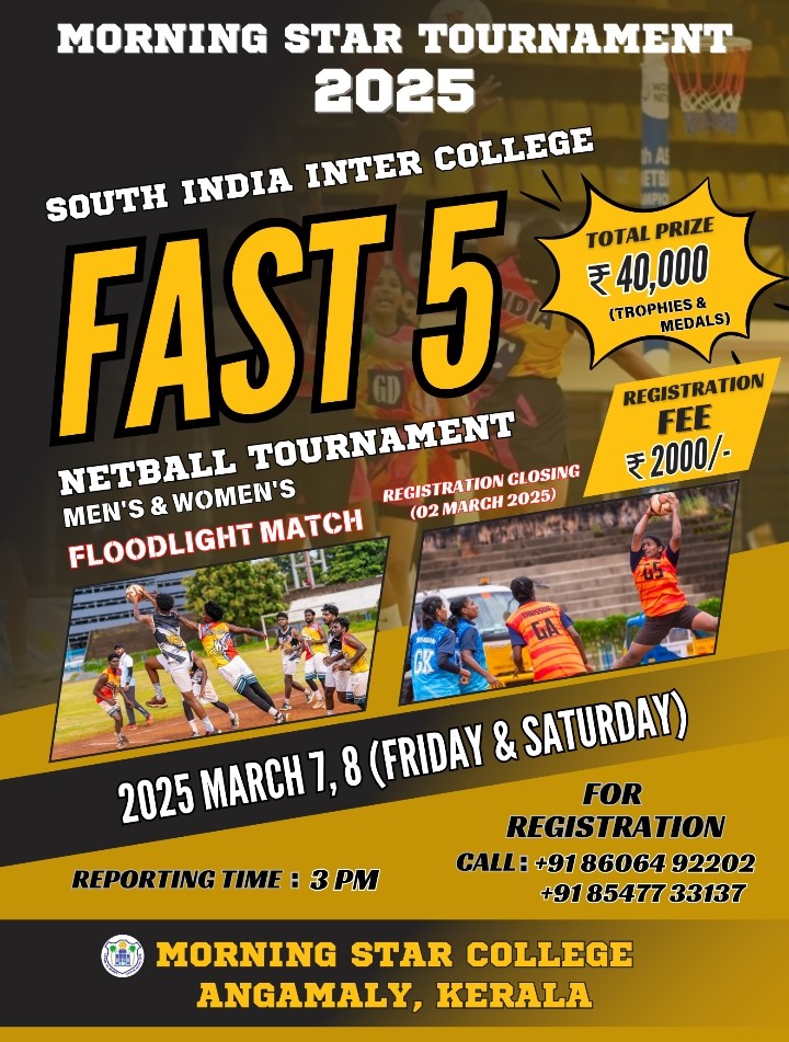 അങ്കമാലി :കേരള സമൂഹത്തിൽ അതിശക്തമായി വ്യാപിച്ചുകൊണ്ടിരിക്കുന്ന ലഹരി എന്ന ആസക്തിക്കെതിരെ Say No to Drugs, Yes to Sports & Health എന്ന ആശയം ഉയർത്തിപ്പിടിച്ചുകൊണ്ട് അങ്കമാലി മോർണിംഗ് സ്റ്റാർ കോളേജിൽ വെച്ച് നടക്കുന്ന സൗത്ത് ഇന്ത്യൻ നെറ്റ്ബോൾ, അഖിലകേരള 3*3 ബാസ്ക്കറ്റ്ബോൾ മോർണിംഗ് സ്റ്റാർ ടൂർണമെന്റ് 2025 മാർച്ച് 7, 8 തീയതികളിൽ നടത്തപ്പെടുകയാണ്. അസിസ്റ്റന്റ് എക്സൈസ് കമ്മീഷണറായ ശ്രീമാൻ മുഹമ്മദ് ഹാരിഷ് ലഹരിക്കെതിരെ കായിക താരങ്ങളെ അണിനിരത്തിയുള്ള പ്രചരണത്തിന് തുടക്കം കുറിക്കുന്നു.