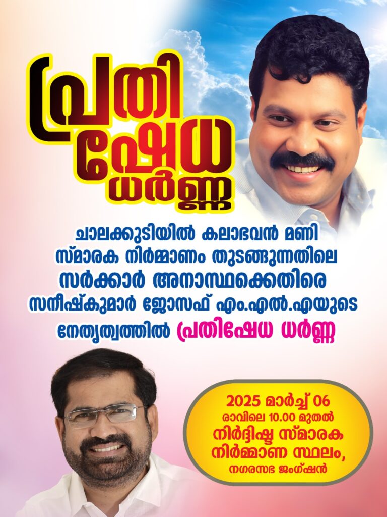 ചാലക്കുടയിൽ കലാഭവൻ മണി സ്മാരക നിർമ്മാണം ആരംഭിയ്ക്കാത്തതിൽ പ്രതിഷേധിച്ച് മാർച്ച് 06 ന് രാവിലെ 10 മണി മുതൽ നിർദിഷ്ട സ്മാരക നിർമ്മാണ സ്ഥലത്ത് കലാകാരൻമാർ, ജനപ്രതിനിധികൾ, പൊതുജനങ്ങൾ ഉൾപ്പടെയുള്ളവരെ പങ്കെടുപ്പിച്ചുകൊണ്ട് ധർണ്ണ സമരം സംഘടിപ്പിയ്ക്കുമെന്ന് സനീഷ്കുമാർ ജോസഫ് എം എൽ എ അറിയിച്ചു.