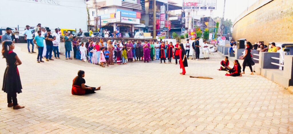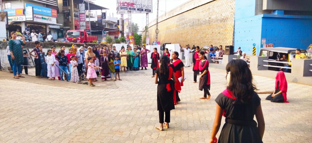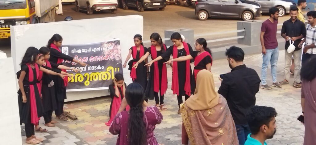 അന്താരാഷ്ട്ര വനിതാദിനത്തോടനുബന്ധിച്ച് ചേളാരി വെളിമുക്ക് എ യുപിസ്കൂളിലെ വിദ്യാർഥി കൾ അവതരിപ്പിച്ച തെരുവ് നാടകത്തിൽ നിന്ന്.