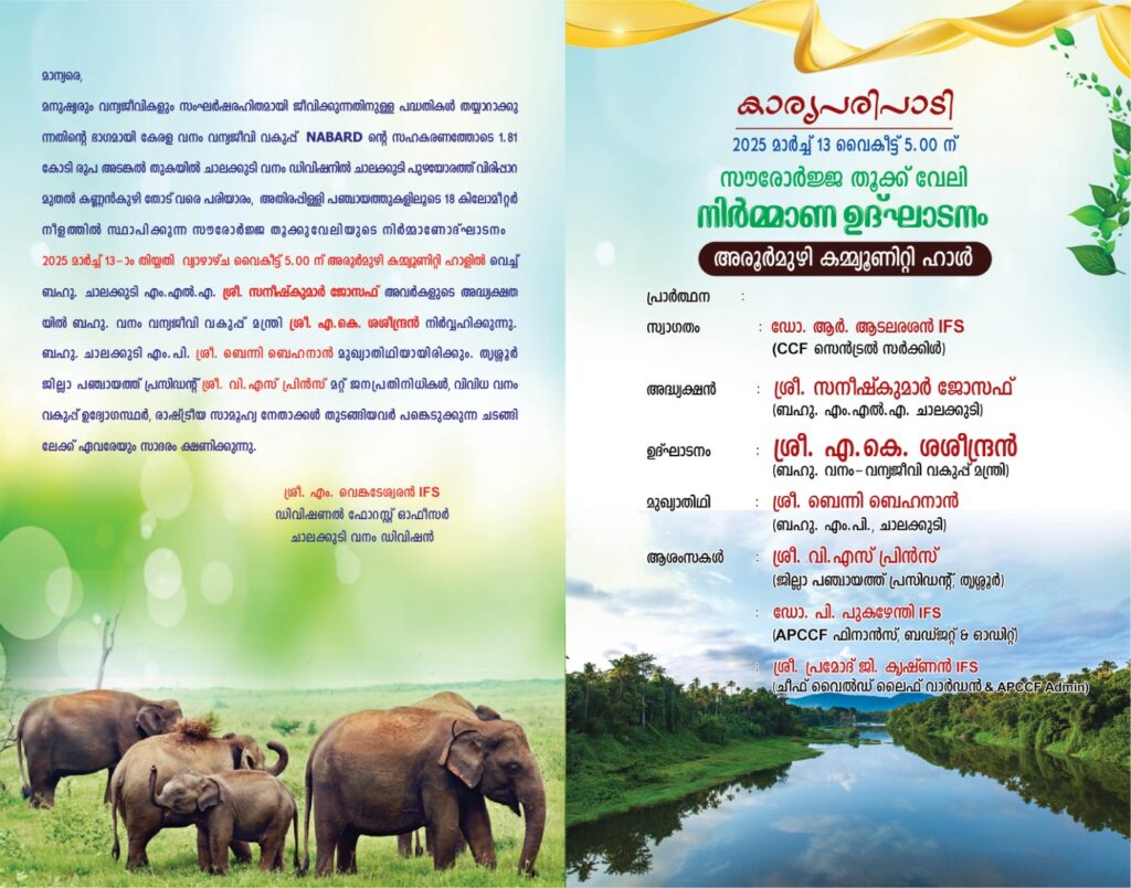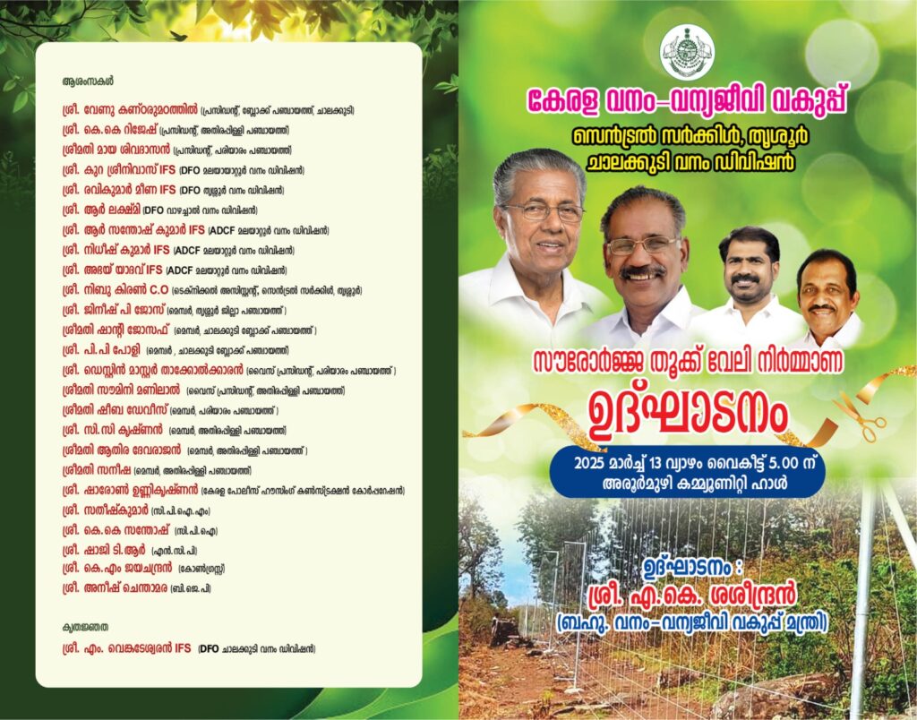 ചാലക്കുടി :ചാലക്കുടി വനം ഡിവിഷന് കീഴിൽ സോളാർ ഫെൻസിങ് സ്ഥാപിയ്ക്കുന്ന പ്രവർത്തിയുടെ നിർമ്മാണോദ്ഘടനം 13ന് വൈകീട്ട് 5 മണിയ്ക്ക് അരൂർമുഴി പഞ്ചായത്ത് കമ്മ്യൂണിറ്റി ഹാളിൽ വച്ച് നടക്കുന്ന ചടങ്ങിൽ വനംവകുപ്പ് മന്ത്രി എ കെ ശശീന്ദ്രൻ നിർവ്വഹിയ്ക്കുമെന്ന് സനീഷ്‌കുമാർ ജോസഫ് എം എൽ എ അറിയിച്ചു.