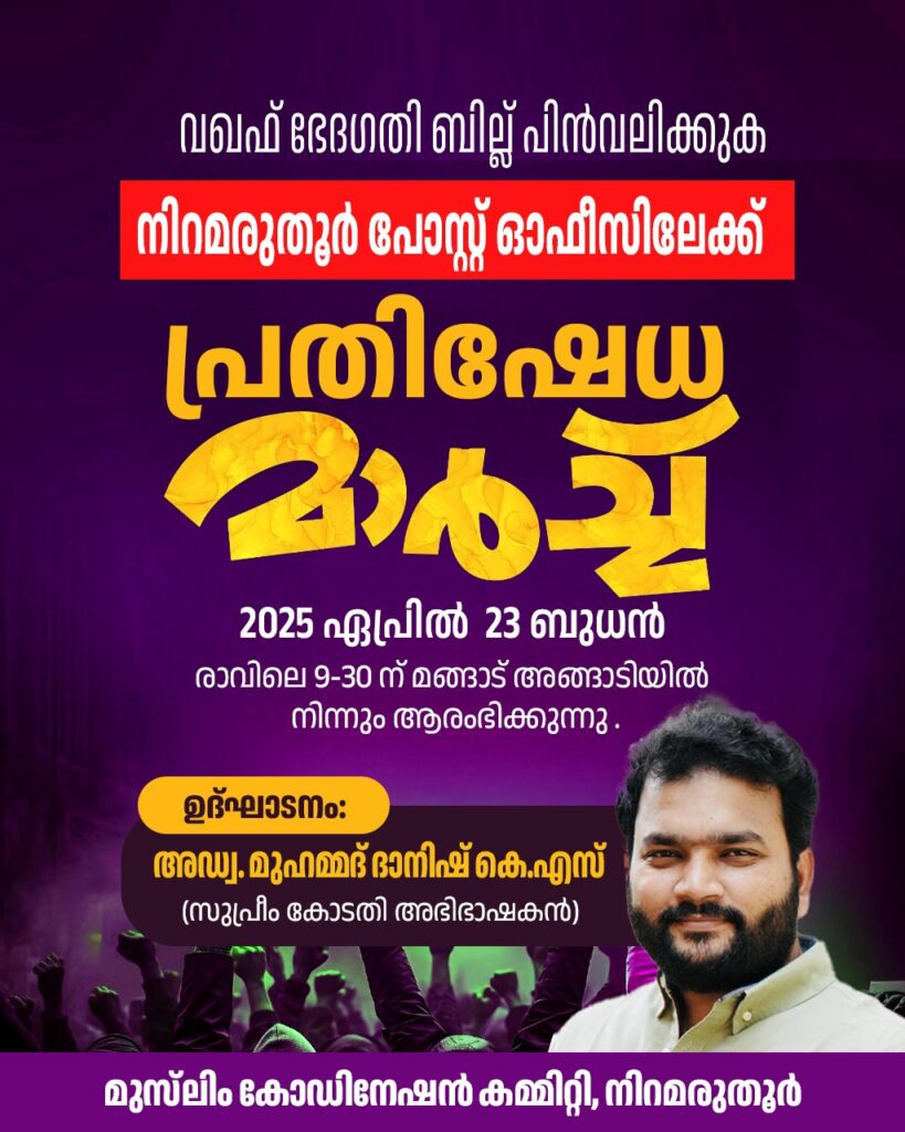 താനൂർ. വഖഫ് ഭേദഗതിയിൽ പ്രതിഷേധിച്ച് നിറമരുതൂർപഞ്ചായത്ത് മുസ്ലിം കോഡിനേഷൻ കമ്മിറ്റിയുടെ നേതൃത്വത്തിൽ നാളെ( ബുധൻ) രാവിലെ പത്തുമണിക്ക് നിറമരുതൂർ പോസ്റ്റ് ഓഫീസിലേക്ക് മാർച്ച് നടക്കും. മാർച്ച് സുപ്രീംകോടതി അഭിഭാഷകൻ അഡ്വക്കറ്റ് കെ.എസ്. ഡാനിഷ് ഉദ്ഘാടനം ചെയ്യും. നിറമരുതൂർ പഞ്ചായത്ത് പ്രസിഡണ്ട് ഇസ്മായിൽ പുതുശ്ശേരി, വിവിധ മുസ്ലിം സംഘടന പ്രതിനിധികൾ സംസാരിക്കും