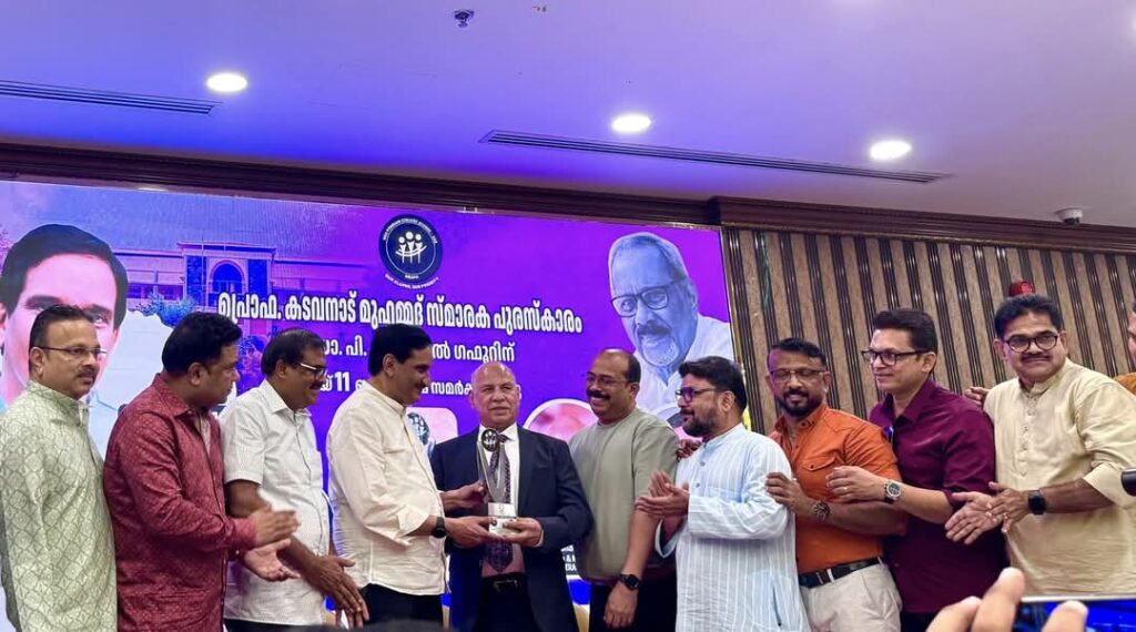 പൊന്നാനി :പൊന്നാനിയുടെ രാഷ്ട്രീയ, സാമൂഹ്യ, വിദ്യാഭ്യാസ മേഖലകളിൽ അമൂല്യമായ സംഭാവനകളർപ്പിച്ച് വിട പറഞ്ഞ പൊന്നാനി എം ഇ എസ് കോളേജ് മുൻ അദ്ധ്യാപകനും എം ഇ എസ് സംസ്ഥാന സെക്രട്ടറിയായിരുന്ന പ്രൊഫസർ കടവനാട് മുഹമ്മദ് സാറിന്റെ സ്മരണാർത്ഥം M E S Ponnani college Alumni U A E chapter (MESPA UAE) ഏർപ്പെടുത്തിയ അവാർഡ് ദുബായിൽ വെച്ചു നടന്ന ചടങ്ങിൽ വെച്ച് K M Trading ചെയർമാൻ K മുഹമ്മദ് സാഹിബിൽ നിന്നും Dr. ഫസൽ ഗഫൂർ ഏറ്റുവാങ്ങി.