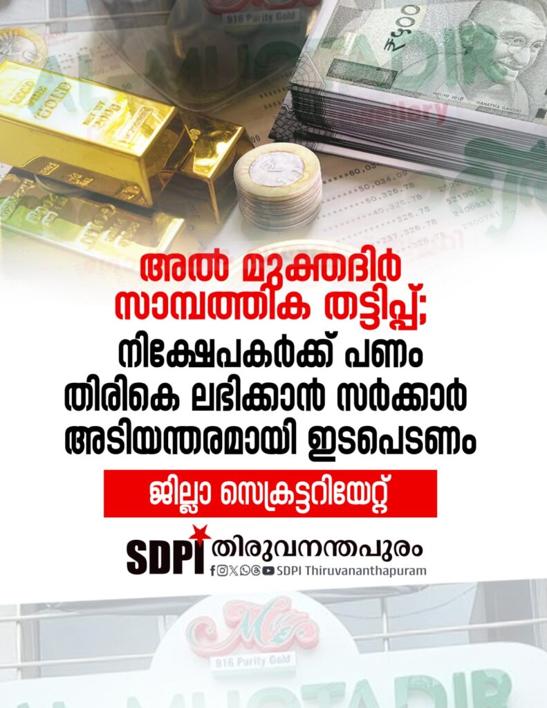 തിരുവനന്തപുരം : അൽ മുക്തദിർ ഗോൾഡ് ആൻഡ് ഡയമണ്ട് ജ്വല്ലറി ഗ്രൂപ്പ് പൊതുജനങ്ങളിൽ നിന്ന് നിക്ഷേപങ്ങൾ സ്വീകരിച്ച് വൻ സാമ്പത്തിക തട്ടിപ്പ് നടത്തിയതായുള്ള വാർത്തകൾ പുറത്തുവരുന്ന സാഹചര്യത്തിൽ നിക്ഷേപകരുടെ പണവും സ്വർണവും തിരികെ ലഭിക്കുന്നതിനായി സർക്കാർ അടിയന്തരമായി ഇടപെടണമെന്ന് എസ്ഡിപിഐ ജില്ലാ സെക്രട്ടറിയേറ്റ് പ്രസ്താവനയിൽ ആവശ്യപ്പെട്ടു.