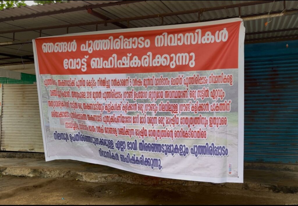 വർഷങ്ങൾക്ക് മുമ്പ് സെവൻസ് ഫുട്ബാേൾ വരെ കളിച്ചിരുന്ന പുത്തിരികണ്ടം ഗ്രൗണ്ട് റോഡ് പ്രവർത്തിക്കായി മെറ്റലും ടാറു ഉൾപ്പെടെ നിക്ഷേപിച്ച് കുട്ടികൾക്ക് വരെ കളിക്കാൻ പറ്റാത്തതരത്തിൽ ഉപയോഗശൂന്യമാക്കിരി യിരിക്കയാണ്ഗ്രൗണ്ട്.നവീകരണത്തിന് ഫണ്ട് നീക്കിവെക്കാൻ പഞ്ചായത്തും ഇതുവരെ തയ്യാറായിട്ടില്ല. ഈ പ്രദേശത്തെ അംഗൻവാടിക്കായി സ്ഥലം വാങ്ങുന്നതിനും കെട്ടിട നിർമ്മാണത്തിനും ഫണ്ട് അനുവദിച്ചിട്ടില്ലന്ന് പ്രദേശവാസികൾ പറഞ്ഞു .സ്ഥലം വാങ്ങുന്നതിനായി അനുവദിച്ച രണ്ട് ലക്ഷം കൊണ്ട് ഇതുവരെ സ്ഥലംവാങ്ങാൻ കഴിഞ്ഞിട്ടില്ല. അഞ്ച് സെൻ്റ് സ്ഥലത്തിനും രജിസ്ട്രേഷനും കൂടി പത്ത് ലക്ഷമെങ്കിലും വേണമെന്നിരിക്കെ ജനങ്ങളെ സമാധാനിപ്പിക്കാനാണ് വഴിക്കടവ്പഞ്ചായത്ത് രണ്ട് ലക്ഷം അനുവദിച്ചതെന്ന് നാട്ടുക്കാർ പറഞ്ഞു.ജനകീയാവശ്യങ്ങൾക്ക് നേരെ പുറം തിരിയുന്നതിനാലാണ് യുവാക്കാൾ തെരഞെടുപ്പ് ബഹിഷ്ക്കരണവുമായി ഫ്ലക്സിൽ എഴുപത്തിനാലോളം പേരുകൾ ഉൾപ്പെടെ ചേർത്ത് പ്രദർശിപ്പിച്ചാണ്