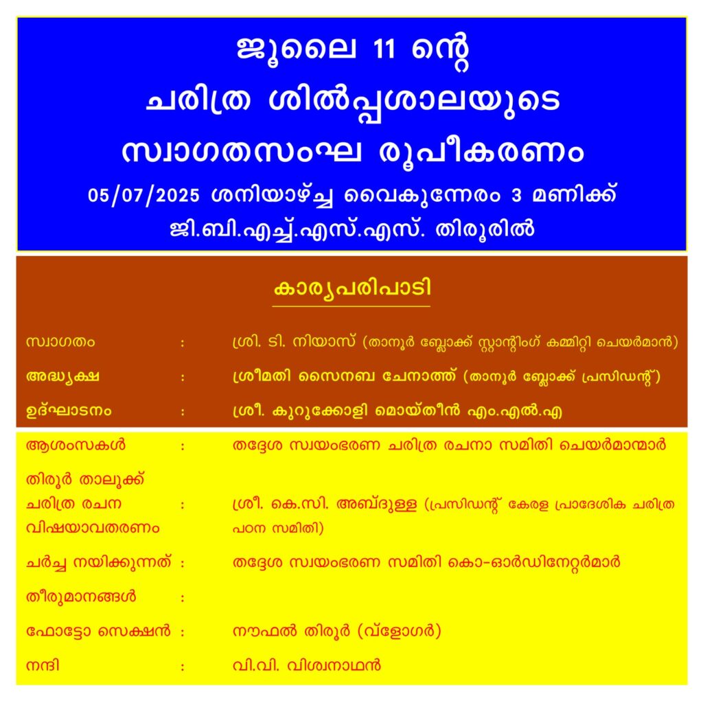 തിരൂർ. ജൂൺ 11ന് തിരൂരിൽ നടക്കുന്ന ചരിത്ര ശിൽപ്പശാലയുടെ സ്വാഗതസംഘ രൂപീകരണം നാളെ വൈകുന്നേരം മൂന്നു മണിക്ക് തിരൂർ ഗവൺമെൻറ് ബോയ്സ് ഹയർ സെക്കൻഡറി സ്കൂളിൽ നടക്കും കുറുക്കോളി മൊയ്തീൻ എംഎൽഎ ഉദ്ഘാടനം ചെയ്യും. താനൂർ ബ്ലോക്ക് പഞ്ചായത്ത് പ്രസിഡണ്ട് സൈനബ ചേനാത്ത്, സ്റ്റാൻഡിങ് കമ്മിറ്റി ചെയർമാൻ ടി .റിയാസ്, ബ്ലോഗർ നൗഫൽ തിരൂർ, കെ .സി .അബ്ദുല്ല എന്നിവർ പങ്കെടുക്കും