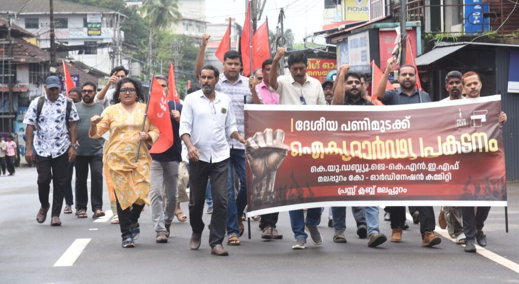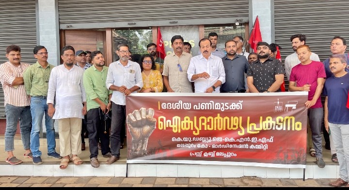 മലപ്പുറം: ദേശീയ പണിമുടക്കിനോടനുബന്ധിച്ച് മലപ്പുറം പ്രസ്ക്ലബ്ബിന്റെ നേതൃത്വത്തില് കെ യു ഡബ്ലിയു ജെ ,കെ എന് ഇ എഫ് ജില്ലാ സംയുക്ത കോ ഓഡിനേഷന് കമ്മറ്റി മലപ്പുറം ടൗണില് പ്രതിഷേധ സംഗമവും പ്രകടനവും നടത്തി.