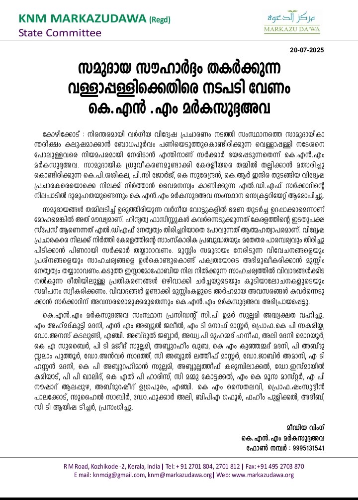 കോഴിക്കോട് : നിരന്തരമായി വര്‍ഗീയ വിദ്വേഷ പ്രചാരണം നടത്തി സംസ്ഥാനത്തെ സാമുദായികാന്തരീക്ഷം കലുഷമാക്കാന്‍ ബോധപൂര്‍വം പണിയെടുത്തുകൊണ്ടിരിക്കുന്ന വെള്ളാപ്പള്ളി നടേശനെ പോലുള്ളവരെ നിയമപരമായി നേരിടാന്‍ എന്തിനാണ് സര്‍ക്കാര്‍ ഭയപ്പെടുന്നതെന്ന് കെ.എന്‍.എം മര്‍കസുദ്ദഅവ. സാമുദായിക ധ്രുവീകരണമുണ്ടാക്കി കേരളീയരെ തമ്മില്‍ തല്ലിക്കാന്‍ മത്സരിച്ചു കൊണ്ടിരിക്കുന്ന കെ.പി.ശശികല, പി.സി ജോര്‍ജ്, കെ സുരേന്ദ്രന്‍, കെ.ആര്‍ ഇന്ദിര തുടങ്ങിയ വിദ്വേഷ പ്രചാരകരെയൊക്കെ നിലക്ക് നിര്‍ത്താന്‍ വൈമനസ്യം കാണിക്കുന്ന എല്‍.ഡി.എഫ് സര്‍ക്കാറിന്റെ നിലപാടില്‍ ദുരുഹതയുണ്ടെന്നും കെ.എന്‍.എം മര്‍കസുദഅവ സംസ്ഥാന സെക്രട്ടറിയേറ്റ് ആരോപിച്ചു.