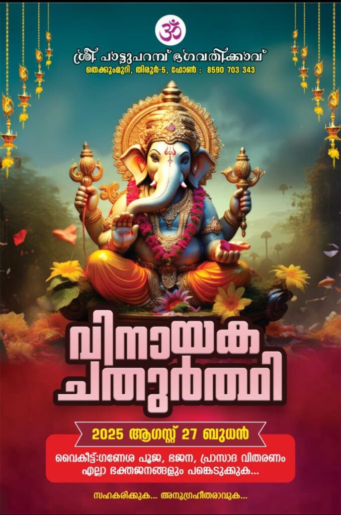 തിരൂർ: തെക്കുമുറി ശ്രീ പാട്ടുപറമ്പ് ഭഗവതിക്കാവ് ക്ഷേത്രത്തിൽ വിനായക ചതുർത്ഥി ആഗസ്റ്റ് 27 ബുധൻ വൈകീട്ട്:ഗണേശ പൂജ, ഭജന, പ്രാസാദ വിതരണം എല്ലാ ഭക്തജനങ്ങളും പങ്കെടുക്കണമെന്ന് ക്ഷേത്ര സമിതി ഭാരവാഹികൾ അറിയിച്ചു.