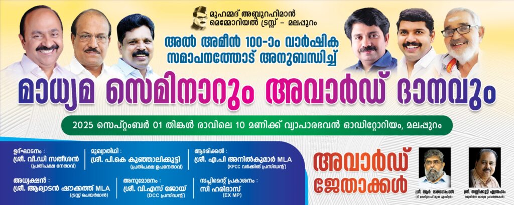 മലപ്പുറം: മുഹമ്മദ് അബ്ദുറഹിമാൻ സാഹിബ് സ്ഥാപിച്ച അൽ അമീൻ പത്രത്തിന്റെ നൂറാം വാർഷികോത്സവത്തിന്റെ സമാപനം പ്രതിപക്ഷ നേതാവ് വിഡി സതീശൻ ഉദ്ഘാടനം ചെയ്യും. മുഹമ്മദ് അബ്ദുറഹിമാൻ ട്രസ്റ്റിന്റെ നേതൃത്വത്തിൽ ഒരു വർഷം നീണ്ടു നിന്ന വിവിധ പരിപാടികൾക്കാണ് നാളെ (തിങ്കളാഴ്ച) രാവിലെ 10ന് മലപ്പുറം വ്യാപാര ഭവനിൽ നടക്കുന്ന മാധ്യമ സെമിനാറോടെ സമാപനം കുറിക്കുന്നത്. പ്രതിപക്ഷ ഉപനേതാവ് പികെ കുഞ്ഞാലിക്കുട്ടി ചടങ്ങിൽ മുഖ്യാതിഥിയാവും.