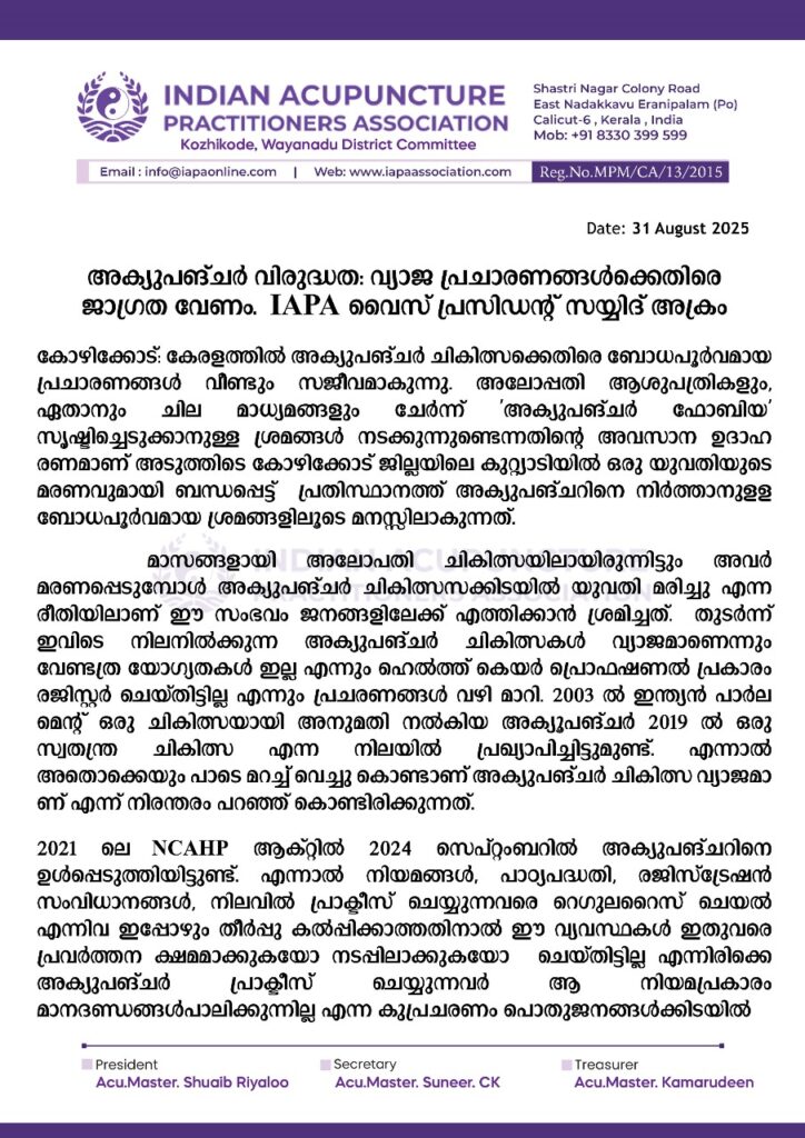 കോഴിക്കോട് : കേരളത്തിൽ അക്യുപങ്ചർ ചികിത്സക്കെതിരെ ബോധപൂർവമായ പ്രചാരണങ്ങൾ വീണ്ടും സജീവമാകുന്നു.