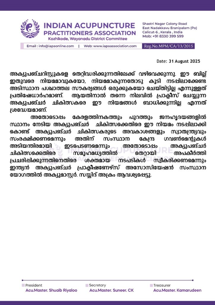 മേൽ സൂചിത നിയമം നടപ്പിലാക്കി കൊണ്ട് അക്യുപങ്ചർ ചികിത്സകരുടെ അവകാശങ്ങളും സ്വാതന്ത്ര്യവും സംരക്ഷിക്കണമെന്നും അതിന് സംസ്ഥാന കേന്ദ്ര ഗവൺമെന്റുകൾ അടിയന്തിരമായി ഇടപെടണമെന്നും അതോടൊപ്പം
