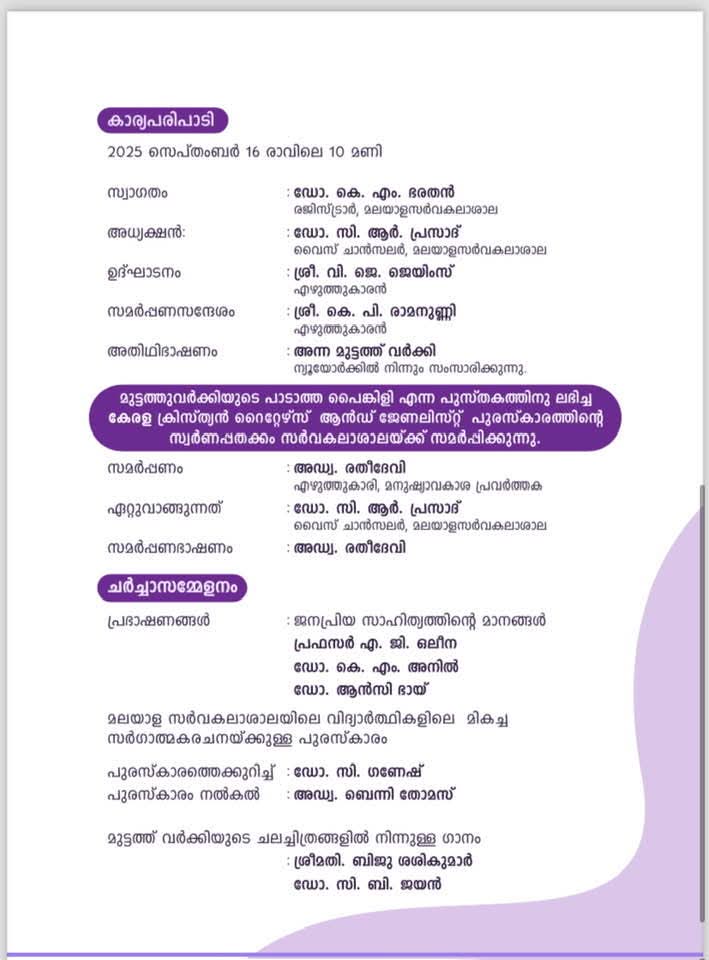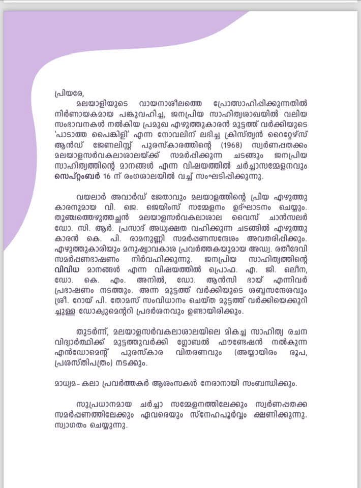 മുട്ടത്തുവർക്കിയുടെ പേരിൽ മലയാള സർവകലാശാലയിലെ സാഹിത്യ രചനാ വിഭാഗത്തിലെ മികച്ച സർഗാത്മക കൃതിക്ക് നൽകുന്ന പുരസ്കാരം സ്നേഹ ടി എസ് ലഭിച്ചു. കെ പി രാമനുണ്ണി, ഡോ സി ഗണേഷ് എന്നിവർ കൺവീനർമാരായുള്ള സമിതിയാണ് പുരസ്കാരം നിശ്ചയിച്ചത്. എഴുത്തുകാരായ ഐസക്ക് ഈപ്പൻ, സുനിൽ ജോസ് എന്നിവർ ജൂറി അംഗങ്ങളായിരുന്നു. സ്നേഹ എഴുതിയ ആഴം എന്ന ചെറുകഥാസമാഹാരമാണ് പുരസ്കാരത്തിന് അർഹമായത്. 5000 രൂപയും പ്രശസ്തി ശില്പവും അടങ്ങുന്ന പുരസ്കാരം സെപ്റ്റംബർ 16ന് മലയാള സർവകലാശാലയിൽ നടക്കുന്ന സ്വർണ്ണ പതക്ക വിതരണ ചടങ്ങിൽ വച്ച് എഴുത്തുകാരൻ വി ജെ ജെയിംസ് സമ്മാനിക്കുമെന്ന് മുട്ടത്തുവർക്കി ഗ്ലോബൽ ഫൗണ്ടേഷൻ ചെയർപേഴ്സൺ അഡ്വ. രതീദേവി (മനുഷ്യാവകാശ പ്രവർത്തക) അറിയിച്ചു.