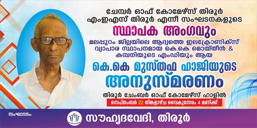 തിരൂർ : തിരൂരിലെ പൗരപ്രമുഖനും ചേമ്പർ ഓഫ് കോമേഴ്സ് തിരൂർ , എംഇഎസ് തിരൂർ, റോട്ടറി ക്ലബ്ബ് എന്നീ സംഘടനകളുടെ സ്ഥാപക അംഗവും പഴയകാല കംബയ്ൻ്റ് ഇലവൻ ക്ലബ്ബിൻ്റെ ഫുഡ്മ്പോൾ പ്ലയറും മലപ്പുറം ജില്ലയിലെ ആദ്യത്തെ ഇലക്ട്രോണിക്സ് സ്ഥാപനമായ കെ കെ മൊയ്തീൻ ആൻഡ് കമ്പനിയുടെ മാനേജിംഗ് ഡയരക്ടറുമായ മുസ്തഫ ഹാജിയുടെ അനുസ്മരണ സമ്മേളനം നാളെ നടക്കും.