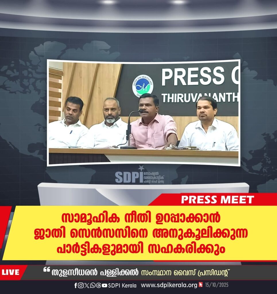 തിരുവനന്തപുരം: രാഷ്ട്ര ശില്പ്പികള് സ്വപ്നം കണ്ട സാമൂഹിക നീതി ഉറപ്പാക്കാന് ജാതി സെന്സസിനെ അനുകൂലിക്കുന്ന രാഷ്ട്രീയ പാര്ട്ടികളുമായി സഹകരിക്കുമെന്ന് എസ്ഡിപിഐ സംസ്ഥാന വൈസ് പ്രസിഡന്റ് തുളസീധരന് പള്ളിക്കല്. രാജ്യത്ത് പതിറ്റാണ്ടുകളായി തുടര്ന്നു പോന്ന സാമൂഹിക വ്യവസ്ഥിതിയുടെയും അപരിഷ്കൃത ജാതി വ്യവസ്ഥയുടെയും ഫലമായി സാമൂഹിക ഭ്രഷ്ടിനും അരികുവല്ക്കരണത്തിനും ഇരകളായ ജനവിഭാഗങ്ങളെ മുഖ്യധാരയിലേക്ക് കൈപിടിച്ചുയര്ത്തുക എന്നതാണ് ഭരണഘടന ഉറപ്പാക്കുന്ന സാമൂഹിക സംവരണത്തിന്റെ താല്പ്പര്യം. സ്വാതന്ത്ര്യം നേടി ഏഴര പതിറ്റാണ്ട് പിന്നിട്ടിട്ടും അധികാരവും അവസരങ്ങളും വിഭവങ്ങളുടെ വിതരണവും ചില സാമൂഹിക വിഭാഗങ്ങളില് മാത്രം കേന്ദ്രീകരിച്ചിരിക്കുന്നു. രാജ്യത്തെ ബഹുഭൂരിപക്ഷം വരുന്ന അധ:സ്ഥിത-പിന്നാക്ക-ന്യൂനപക്ഷ വിഭാഗങ്ങള് എന്നും കൂടുതല് കൂടുതല് അരികുവല്ക്കരിക്കപ്പെട്ടുകൊണ്ടിരിക്കുകയാണ്. സാമ്പത്തിക സംവരണം നടപ്പാക്കിയതിലൂടെ ഈ സാമൂഹിക അനീതി കൂടുതല് ശക്തമാവുകയാണ്.