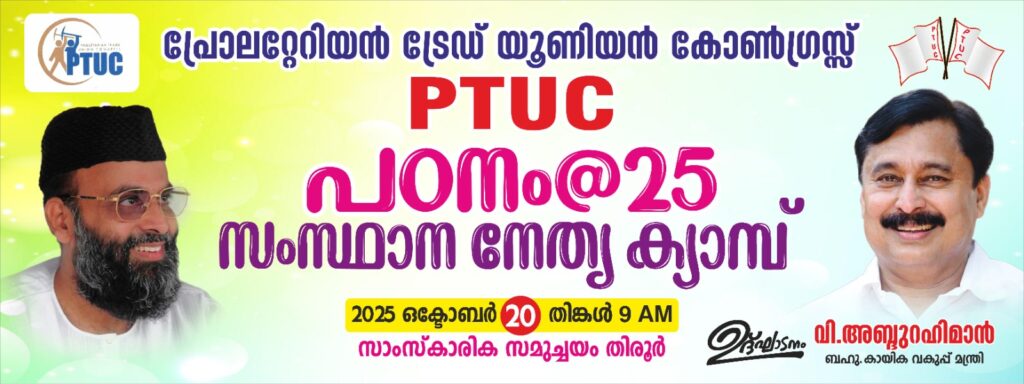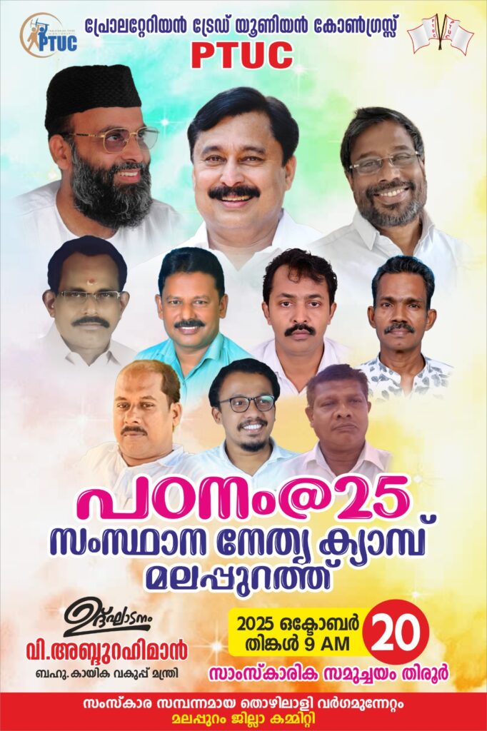 മലപ്പുറം: പിഡിപിയുടെ തൊഴിലാളി സംഘടനയായ പി. ടി. യു. സി “പ്രോലെറ്റേറിയൻ ട്രേഡ് യൂണിയൻ കോൺഗ്രസ്” സംസ്ഥാന നേതൃ ക്യാമ്പ് ‘പഠനം@2025’ ഇന്ന് തിരൂർ മുനിസിപ്പൽ സാംസ്കാരിക സമുച്ചയ (ജാഫറലി ദാരിമി നഗർ) ത്തിൽ രാവിലെ 10 മണിക്ക് കായിക വകുപ്പ് *മന്ത്രി
