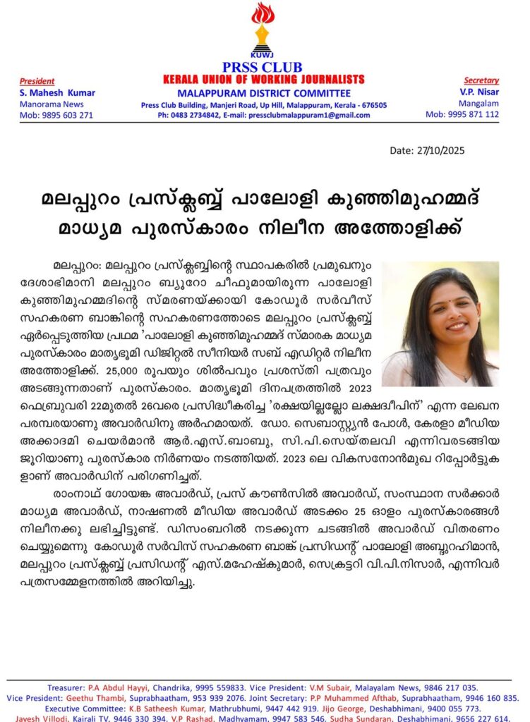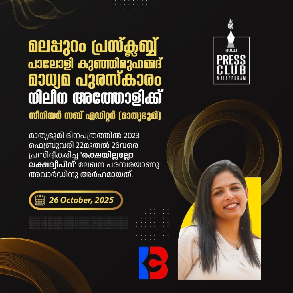 മലപ്പുറം: മലപ്പുറം പ്രസ് ക്ലബിന്റെ സ്ഥാപകരില് പ്രമുഖനും ദേശാഭിമാനി മലപ്പുറം ബ്യൂറോ ചീഫുമായിരുന്ന പാലോളി കുഞ്ഞിമുഹമ്മദിന്റെ സ്മരണയ്ക്കായി കോഡൂര് സര്വിസ് സഹകരണ ബാങ്കിന്റെ സഹകരണത്തോടെ മലപ്പുറം പ്രസ് ക്ലബ് ഏര്പ്പെടുത്തിയ പ്രഥമ ‘പാലോളി കുഞ്ഞിമുഹമ്മദ് സ്മാരക മാധ്യമ പുരസ്കാരം’ മാതൃഭൂമി ഡിജിറ്റല് സീനിയര് സബ് എഡിറ്റര് നിലീന അത്തോളിക്ക്. 25,000 രൂപയും ശില്പവും പ്രശസ്തി പത്രവും അടങ്ങുന്നതാണ് പുരസ്കാരം. മാതൃഭൂമി ദിനപത്രത്തില് 2023 ഫെബ്രുവരി 22 മുതല് 26 വരെ പ്രസിദ്ധീകരിച്ച ‘രക്ഷയില്ലല്ലോ ലക്ഷദ്വീപിന്’ എന്ന ലേഖന പരമ്പരയാണ് അവാര്ഡിന് അര്ഹമായത്. ഡോ. സെബാസ്റ്റ്യന് പോള്, കേരളാ മീഡിയ അക്കാദമി ചെയര്മാന് ആര്.എസ് ബാബു, സി.പി സെയ്തലവി എന്നിവരടങ്ങിയ ജൂറിയാണ് പുരസ്കാര നിര്ണയം നടത്തിയത്.