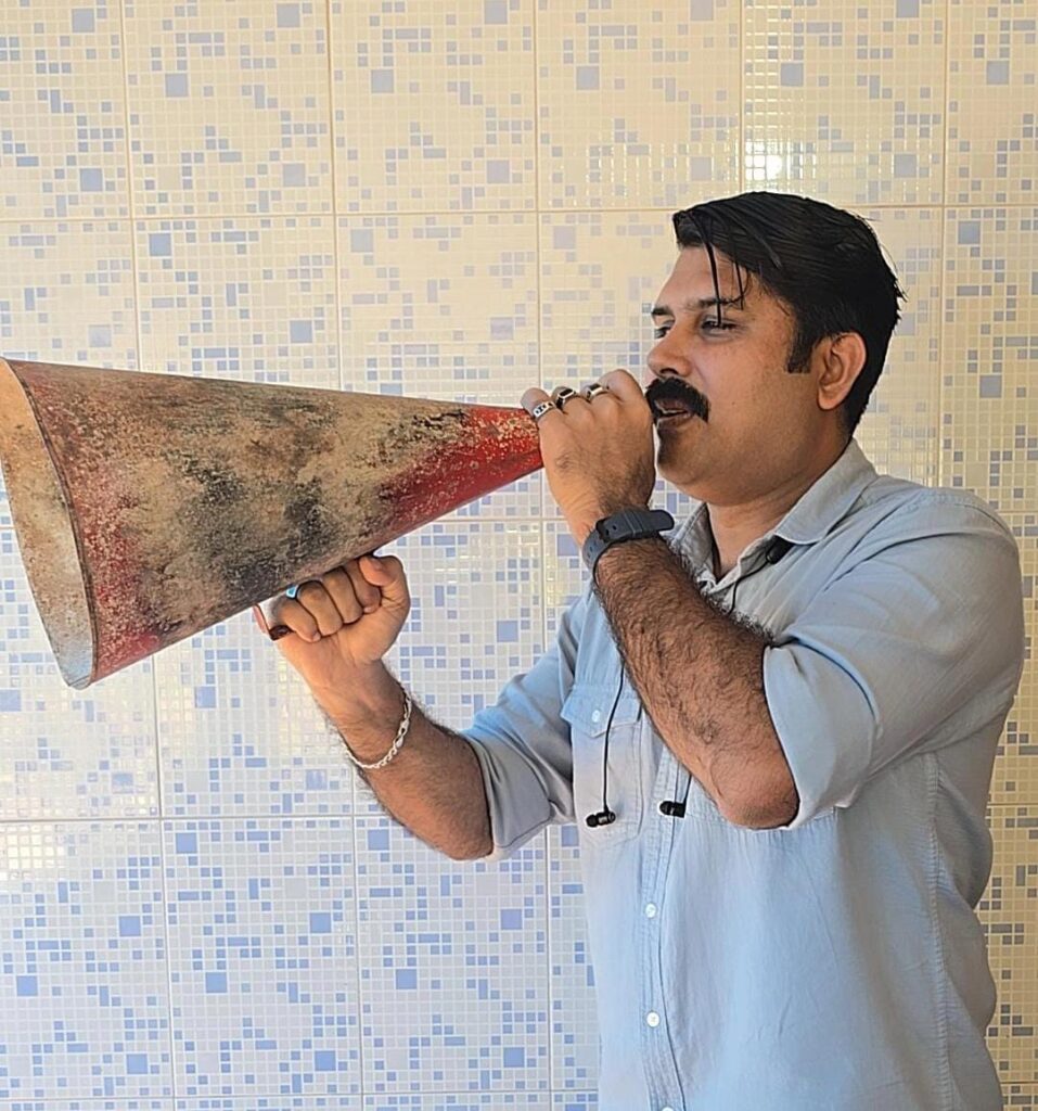 പഴയബാലറ്റ് ബോക്സും മെഗാ ഫോണുമായി കെ പി സുനീർ,