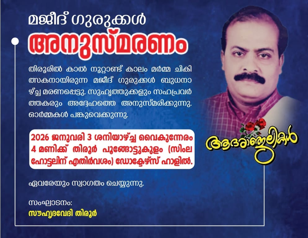 തിരൂർ. കാൽ നൂറ്റാണ്ട് കാലം തിരൂരിൽ കളരി അഭ്യാസിയായും മർമ്മ ചികിത്സകനായും സേവനമനുഷ്ഠിച്ചിരുന്ന മജീദ് ഗുരുക്കളെ തിരൂർ നഗരം അനുസ്മരിക്കുന്നു. സൗഹൃദ വേദി തിരൂർ സംഘടിപ്പിക്കുന്ന അനുസ്മരണ യോഗം( നാളെ) ശനിയാഴ്ച വൈകുന്നേരം നാലുമണിക്ക് പൂക്കോട്ടുകുളത്തുള്ള ഡോക്ടേഴ്സ് ഹാളിൽ ആണ് നടക്കുക. മജീദ് ഗുരുക്കളുടെ സഹപ്രവർത്തകരും സുഹൃത്തുക്കളും പരിപാടിയിൽ സംബന്ധിക്കും.
