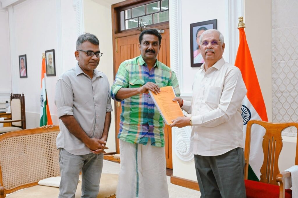 ഗവർണർ രാജേന്ദ്ര വിശ്വനാഥ് അർലേക്കർ. വർക്കിംഗ് ജേണലിസ്റ്റ് ആക്ട് പുനസ്ഥാപിക്കുക, ലേബർ കോഡ് പിൻവലിക്കുക തുടങ്ങിയ ആവശ്യങ്ങളുന്നയിച്ച്