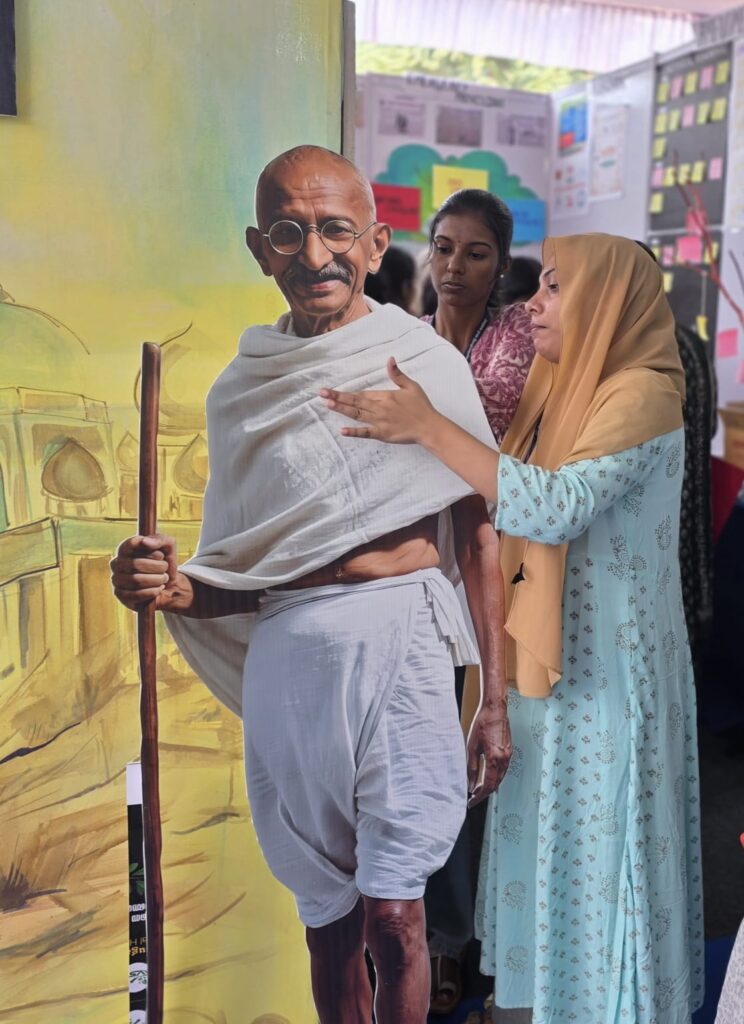 തേഞ്ഞിപ്പാലം :ശാസ്ത്രയാൻ പ്രദർശനത്തിനായ് കാലിക്കറ്റ് സർവകലാശാല കാമ്പസിൽ പൊളിറ്റിക്കൽ സയൻസ് വിഭാഗമൊരുക്കിയ കോൺസ്റ്റിറ്റ്യൂഷണൽ ബിനാലെ പ്രോഗ്രാമിൽ മഹാത്മാഗാന്ധിയുടെ കട്ടൗട്ട് ഒരുക്കുന്ന എം എ പൊളിറ്റിക്കൽ സയൻസ് വിദ്യാർത്ഥിനി പികെ അൻജില.