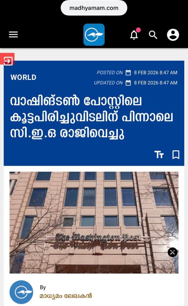വാഷിങ്ടൺ: യു.എസ് ദിനപത്രമായ വാഷിങ്ടൺ പോസ്റ്റിലെ പബ്ലീഷറും സി.ഇ.ഒയുമായ വിൽ ലൂയിസ് രാജിവെച്ചു. പത്രത്തിലെ കൂട്ടപിരിച്ചുവിടലിന് പിന്നാലെ ശനിയാഴ്ചയാണ് അദ്ദേഹം രാജിസമർപ്പിച്ചത്. തന്റെ കാലയളവിൽ ബുദ്ധിമുട്ടേറിയ പല തീരുമാനങ്ങളും എടുക്കേണ്ടി വന്നിരുന്നു. വാഷിങ്ടൺ പോസ്റ്റിന്റെ സുസ്ഥിരമായ ഒരു ഭാവിക്ക് വേണ്ടിയായിരുന്നു അത്തരം തീരുമാനങ്ങൾ എടുത്തത്. ഓരോ ദിവസവും ദശലക്ഷക്കണക്കിന് ഉപഭോക്താക്കൾക്ക് ഉയർന്ന നിലവാരമുള്ള പക്ഷപാതരഹിതമായ വാർത്തകൾ നൽകാൻ വാഷിങ്ടൺ പോസ്റ്റിന് കഴിയട്ടെയെന്നും അദ്ദേഹം ജീവനക്കാർക്ക് അയച്ച കത്തിൽ ചൂണ്ടിക്കാട്ടി.