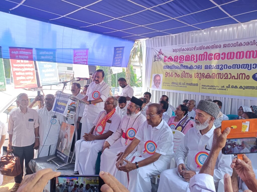 ജനങ്ങളെ പ്രലോഭിപ്പിച്ച് കുടിപ്പിക്കുന്ന എൽ.ഡി.എഫ് സർക്കാരിന്റെ മദ്യനയം തിരുത്തണം എന്നാവശ്യപ്പെട്ട് 914 ദിവസങ്ങളായി മലപ്പുറം കളക്ടറേറ്റിന് മുന്നിൽ കേരള മദ്യനിരോധന സമിതി നടത്തി വന്നിരുന്ന സത്യാഗ്രഹം സമാപിപ്പിക്കുന്ന പൊതുസമ്മേളനം ഉദ്ഘാടനം ചെയ്യുകയായിരുന്നു അദ്ദേഹം.