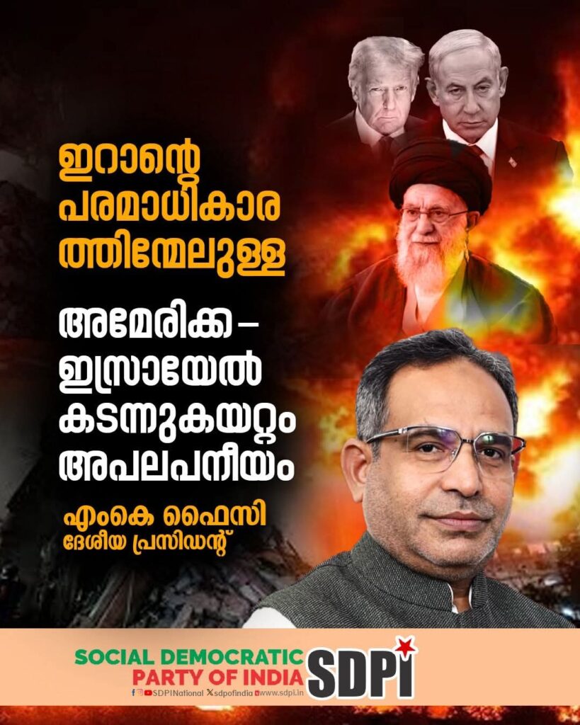 ​ന്യൂഡൽഹി: ഇസ്ലാമിക് റിപബ്ലിക് ഓഫ് ഇറാനെതിരെ അമേരിക്കയും ഇസ്രായേലും സംയുക്തമായി നടത്തുന്ന സൈനിക കടന്നുകയറ്റത്തെ എസ്‌ഡിപിഐ ദേശീയ പ്രസിഡന്റ് എം.കെ. ഫൈസി ശക്തമായി അപലപിച്ചു. ഇത് അന്താരാഷ്ട്ര നിയമങ്ങളുടെ നഗ്നമായ ലംഘനമാണെന്നും മേഖലയിലെയും ലോകത്തെയും സമാധാനത്തെ തകർക്കുന്ന അപകടകരമായ നീക്കമാണെന്നും അദ്ദേഹം പ്രസ്താവിച്ചു. ഇത്തരം നടപടികൾ നയതന്ത്ര ശ്രമങ്ങളെ തകർക്കുകയും മിഡിൽ ഈസ്റ്റിനെ അസ്ഥിരപ്പെടുത്തുകയും നിരപരാധികളായ സാധാരണക്കാരുടെ ജീവിതത്തെ ഗുരുതരമായി അപകടത്തിലാക്കുകയും ചെയ്യും. ബാഹ്യമായ ഈ കടന്നുകയറ്റങ്ങൾക്കെതിരെ ഇറാനോട് അദ്ദേഹം ഐക്യദാർഢ്യം പ്രകടിപ്പിച്ചു.